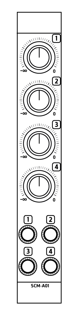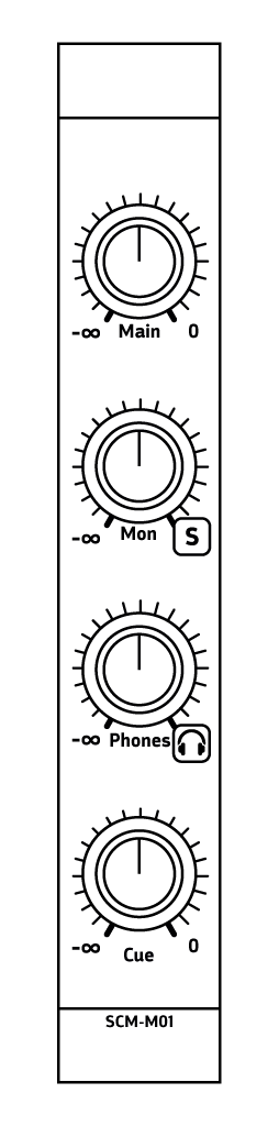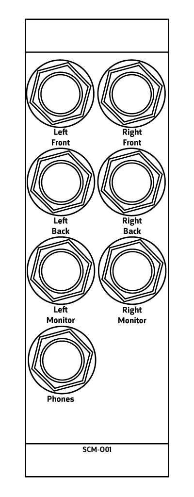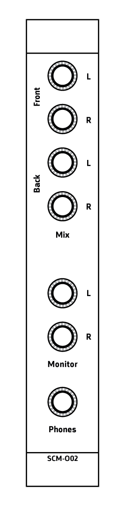 The SCM-O01 output module offers a way to connect your modular mixer to the outside world through 6.35mm jack. It offers main output for the quadraphonic signal (in used in stereo, Front and Back will output the same stereo signal), monitor output and headphone output.