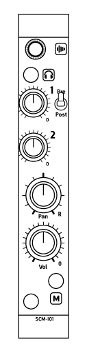 The SCM-I01 offers a basic mono input channel strip packed with functionality: PFL, 2 aux sends (one pre/post switchable), signal indicator, panning, level, solo and mute. The solo and mute circuits are designed to be free of clicks and pops when engaged which makes this module perfectly suitable for performance use.