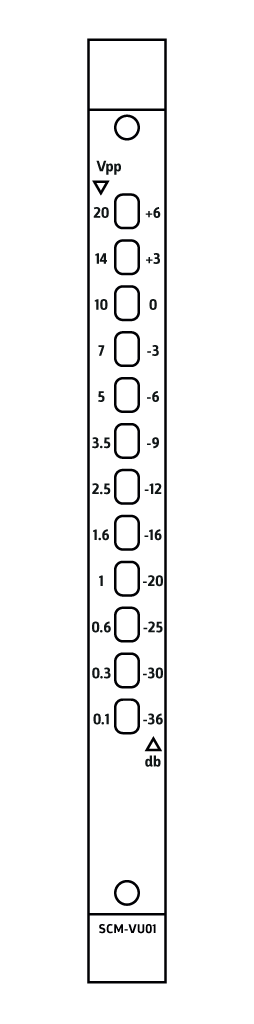 2HP VU meter which can be used everywhere in the system. It can be hooked up to individual outputs, inputs throughout the system. The VU meter offers 2 different readouts, on the left you find a Vpp (Voltage Peak to Peak) readout, on the right side you find a readout in db for Eurorack audio levels ( 0db = 10Vpp).